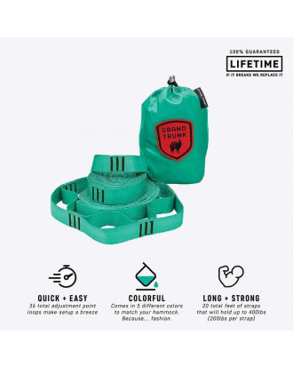 Grand Trunk Hängematten haben eine lebenslange Garantie . Sie sind sehr überzeugt von modernster Material- und Verarbeitungstechnologie. Das TRUNKTECH-Material ist außerdem wasserdicht, sodass die Hängematte auch als Dach dienen kann, als Notunterkunft bei schlechtem Wetter. Das Material ist so weich und angenehm, dass es als leichte Decke verwendet werden kann.